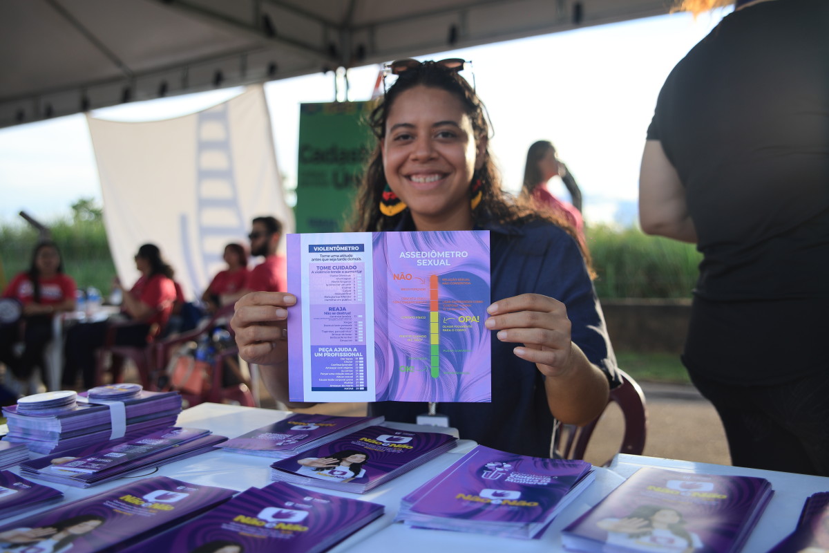 Em outro espaço do evento, conversas importantes aconteciam. Mulheres se reuniam para falar sobre proteção, respeito e liberdade. Segundo a coordenadora da Coordenadoria de Políticas Públicas para Mulheres, Anne Cleyanne, muitas vezes o primeiro passo é simplesmente ouvir. “Hoje estamos batendo um papo sobre medidas protetivas, ciclos de violência e também fazendo acolhimento. Muitas vezes a mulher precisa de uma palavra de incentivo, de apoio, de um abraço. Estamos conversando sobre a diferença entre cantada e assédio, para que elas possam se sentir seguras com suas decisões, com seu corpo. Tudo aquilo que constrange a mulher é violência.”