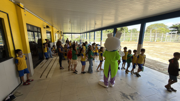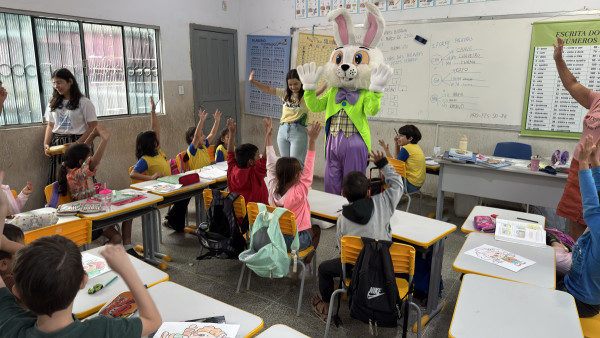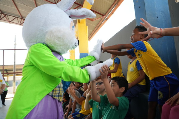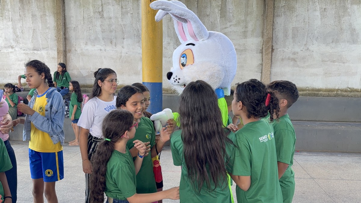 Alunos da Escola Chiquilito Erse ganharam chocolate e receberam o coelhinho da Páscoa