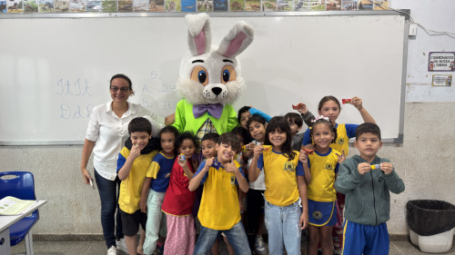 Alunos da Escola Chiquilito Erse ganharam chocolate e receberam o coelhinho da Páscoa.